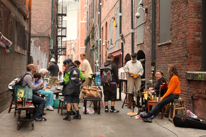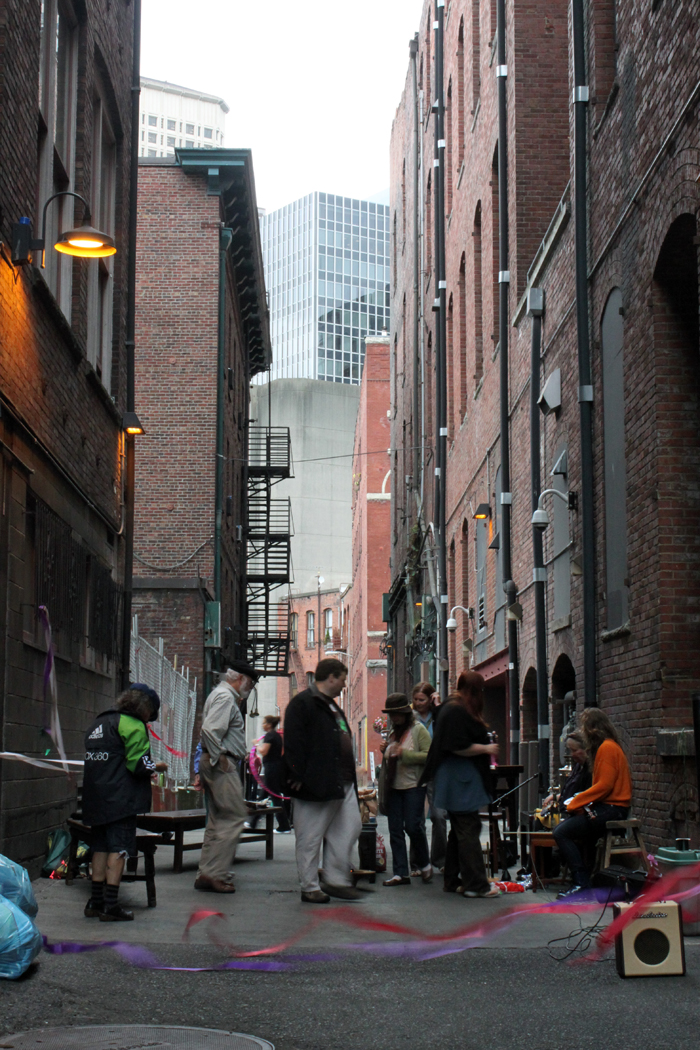 Last First Thursday in Pioneer Square, Firehouse Alley also had a great party where we had Irish folk music, hula hoopers, and marshmallow roasting in the alley! There was a great turn out and it is inspiring to think we started working on this alley a year ago and now it is seeing nearly 50-100 people come through every first thursday. Join us at the next party on August 3rd!